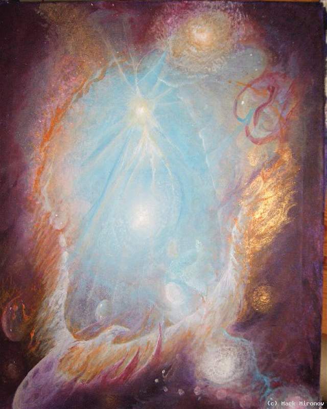 "Rising into hope" ist das erste Bild des neuen Zyklus des Malers Mark Mironov. Es läßt bereits die Entwicklung ahnen, also ob die nachfolgenden Bilder wie ein Hineinzoomen in das vorherige wären. Er bringt Licht,Farben und Formen in einen magischen arche |