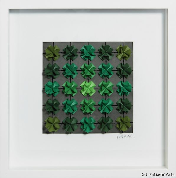 handgefaltete Tessellation aus hochwertigem, alterungsbeständigem Einbandpapier mit eingesetzten floralen Elementen aus original japanischem Papier im verglasten Spezial-Vollholz-Kastenrahmen |