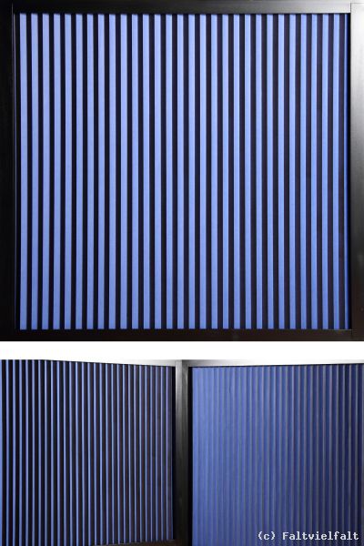 Blueshift - Blauverschiebung Werkgruppe: Korrugationen, handkoloriert Kunstart: Skulptur Technik: Relief Stil: Op Art / Hard Edge 70 x 75 x 3 cm 29,5 x 27,6 x 1,2 in Jahr: 2015 Signatur: hinten signiert