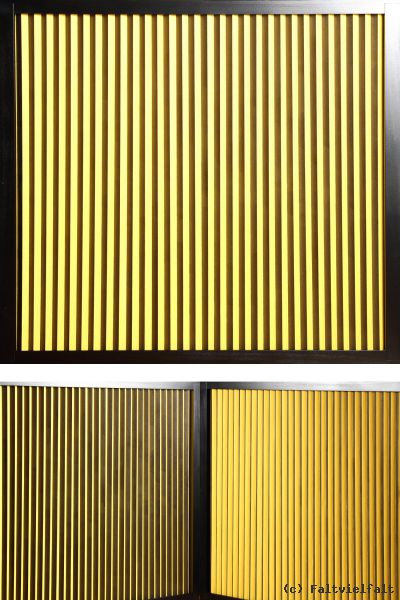 Interference - Interferenz Werkgruppe: Korrugationen, handkoloriert Kunstart: Skulptur Technik: Relief Stil: Op Art / Hard Edge 70 x 75 x 3 cm 29,5 x 27,6 x 1,2 in Jahr: 2015 Signatur: hinten signiert